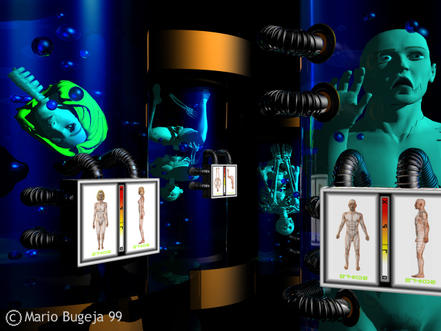 "K-lab" is the last piece I did before starting Luna6, Everything, from the textures on the display monitors, to the tubes coming out of them was modeled in Bryce3d, everything was modeled in Bryce3ed actually, except for the figures. The K-lab is a sinister place, where human test subjects "volunteer" to under go all sorts of experiments in the name of science. I've also rendered close-ups of the different containment units, if you'd like to view the click on the link below called "k-lab".... |