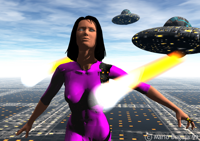 This is where I started to experiment (still not knowing how to import those Poser3 textures) with my figures. Ungrouping the meshes, I was able to assign different Bryce textures to different parts of the body. I really like this picture, it just seams so sci-fi to me, the android girl, the probe spacecraft, the never ending sky, the hi-tech computer ground which keeps on going past the horizon. Basically what happened is that this female android some how develops a conciseness, and is aware of her self, realizing that she is a slave, a prisoner she flees from her creators. It doesn't take long for them to realize she has escaped, sending a squad of probe ships they are soon hot on the little android's trail. This was also meant to be a frame in another 3d Bryce/Poser comic I had planed to do, but due to lack of time I was unable to pull this off. Maybe some day I will.... |